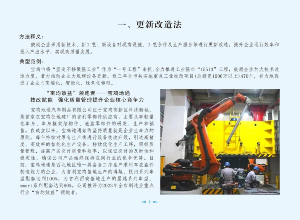 在10月21日宝鸡市工业领域大规模设备更新供需对接会上,宝鸡市工信局发布了《宝鸡市“亩均论英雄”综合改革工业企业亩均效益提升十法政策指引》,鼓励和引导企业通过“更新改造、产品升级、产业转型、科技研发、智改数转、绿色发展、产销对接、集聚入园、整合重组、腾笼换鸟”等10种方法,加快发展方式转型升级,提升发展质量和效益,推动全市工业经济高质量发展。