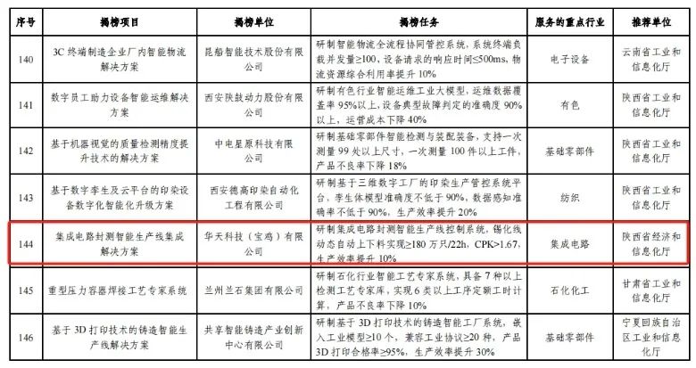 日前,国家工业和信息化部公布了2023年度智能制造系统解决方案揭榜挂帅项目名单,陕西省共有4个项目入选。我市华天科技(宝鸡)有限公司(以下简称:华天宝鸡)的集成电路封测智能生产线集成解决方案位列其中,是我市唯一一家入选的项目。